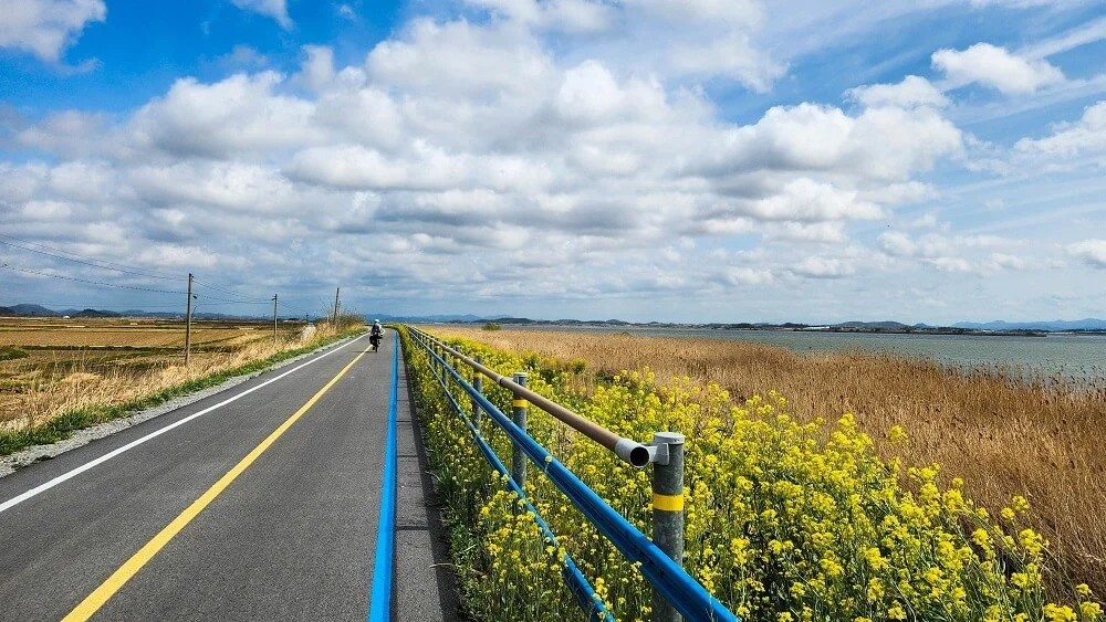 It didn’t help that the morning headwinds were so strong that cycling here felt like drag. But the landscapes drastically change with a sea of yellow flowers — you’ll primarily see the Yeongsangan river on one side including farms and rural landscapes.