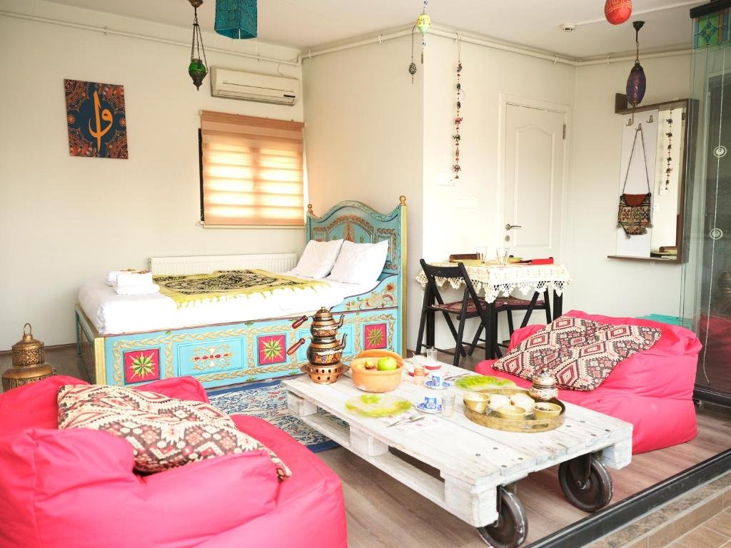 Turquoise walls, a red door, hand-painted signs, hanging lanterns, painted beds, poufs, beanbags - it is quirky, colourful, and right in the heart of Balat.